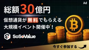 総額30億円相当の仮想通貨が完全無料でもらえるイベントが開始されました。前回大好評だった「SoSoValue」が第2弾となる$SOSO配布を来年第1四半期に実施すると発表。参加タスクはチェックインやXフォロー、動画視聴など簡単なものばかりです。